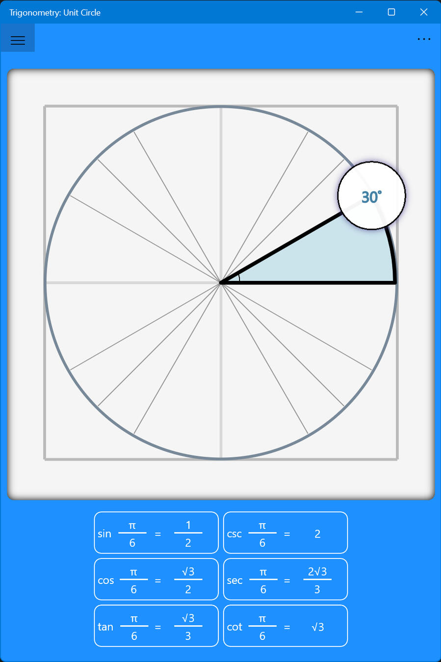 Trigonometry: Unit Circle is an interactive and visual way to learn Trigonometry.+Learn the basics of Trigonometry by exploring the unit circle.+Learn how the Trigonometric functions change as you change the angle of the Unit Circle.